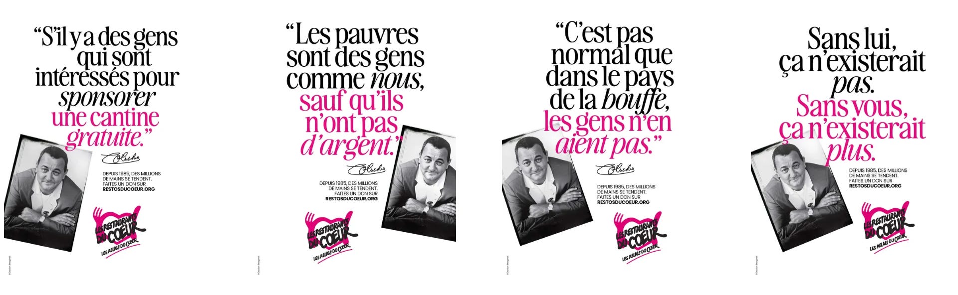 La campagne reprend des phrases chocs que Coluche a prononcées lors du lancement de l’association. Elles restent efficaces car tout le monde peut les comprendre.